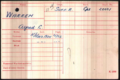 1901 census...Aged 2, he was at North Street, Burwell with his father William WARREN, [32] stationary engine driver, born Burwell; his mother Ada [32], born Burwell; brother Frederick W. [5] born Stratford, Essex; sister Clara [4] born Burwell and brother Arthur [1] born Burwell. 1911 census...Aged 12, he was at North Street, Burwell with his widower father, sister Clara and brother Arthur. His mother had died in 1905. |