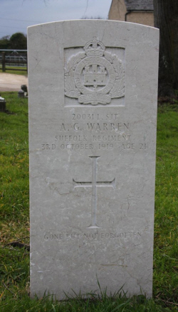 At depot he was posted to 3rd battalion on 24th April 1915, embarked at Folkestone on 26th April 1917 to go to the British Expeditionary Force in France, 5th Infantry Base Depot then on 30th April to 11th Battalion, Suffolk Regiment. He received a gun shot wound to the buttocks on 11th June 1917, attended 103 Field Ambulance, then 42 Casualty Clearing Station and then a base hospital before returning to his unit on 24th June 1917. The battalion were in the line at Green Line in the Gavrelle sector (France) He then received a shell wound to his face on 10th October 1917 which saw him sent to Etaples to 7th Canadian General Hospital. His records are too faded to read then until 1918. At this time the battalion was in Flanders around Proven, repairing roads in the forward area, a severe and unpleasant task carried out in daylight under constant shell and machine gun fire, which cost the battalion 50 casualties over three days. Promotions were to unpaid Acting Lance Corporal 29th November 1917, to paid Lance Corporal on 9th April 1918 and full corporal on 16th September 1918, and then to paid Lance Sergeant on 6th November 1918 He returned to England on 1st March 1919 and was transferred on demob to Z Reserve on 1st April 1919 giving his intended residence as North Street, Burwell. He was found drowned in the river at Burwell. Letters in his pocket said it was "impossible to forget the past". A coroner's inquest gave the verdict of "suicide whilst of unsound mind". The newspaper report on Friday, October 10, 1919 records :- EX-SERGEANT'S TRAGIC DEATH. - Found Drowned in the River Near Burwell. An inquiry was conducted by the County Coroner (Col.A.J.Lyon) at Burwell on Saturday, into the circumstances attending the death of Alfred George Warren, of Burwell who was found drowned in the river on the previous day. The first witness called was William Warren, of Burwell, who identified the body as that of his son, who was 21 years of age. He was a general labourer, and had been a sergeant in the 11th Suffolks. At 9.30 on Friday morning he was in the house, apparently quiet. Witness asked him how he was, and he complained about his head. He had previously been attended for depression. He went out of the house and was away a long time, so witness made inquiries, and found he had been seen near the river. At about 2.30 witness found the deceased's hat and coat on the bank near the bridge,and in the pockets were two letters, in which he said it was "impossible to stick this life any longer. He could not forget the past". Witness did not know to what this referred. He had served our years in France and had been wounded twice and gassed. He had been very quiet since he came home. Arthur Henry Dunnett, of Burwell, stated that at 11.45 a, he saw Mr.Warren's son on the Lode bank, walking towards Burwell. Witness said his people were looking for him, and Warren replied that he would be home before dinner. Richard Goodchild, of Burwell, a bargeman, said he heard at about 3 pm that a man was in the Lode. Witness went to the spot and searched and found Warren. He was quite dead, and his coat and cap were off. Witness examined the bank, and found where the man had gone into the river: it looked as if he had slipped in sitting down. He could have stood up six feet from the bank, so he must have walked a step or two after getting in the river before he reached the deep part. The bank was not steep. P.C. Horace Ray, stationed at Burwell, gave evidence that he was called to the Lode, where he found the deceased lying in a barge. A letter and some money were found on him. There were no marks on the body, other than wounds received during the war. There was froth at the mouth and nose. A verdict of "Suicide whilst of unsound mind" was returned. |