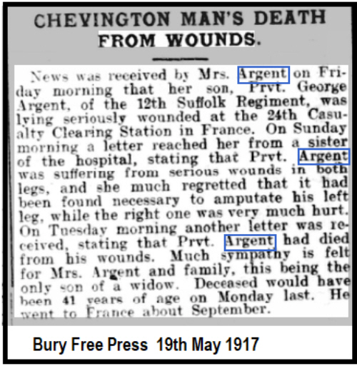 George Argent was born 1876 (2nd qtr 1876 Thingoe 4a:552) son of Robert and Mary Ann ARGENT (née WATSON)