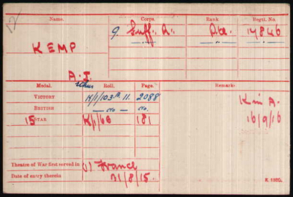 Arthur James Kemp was born in Chedburgh (1st qtr 1889 Thingoe 4a:692) son of David and Sarah KEMP (née PLUME)