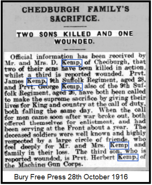1891 census...Aged 2, he was at Bury Road Cottages, Chedburgh with his father David KEMP [31] farm labourer; his mother Sarah [29] born Great Welnetham; brothers David Harry [3] and John William [11 months]. All except his mother born in Chedburgh. 1901 census...Aged 12, he was still at Bury Road with his parents; brothers David Harry, George Robert [9] and John Herbert[7]; sisters Eliza Gertrude [4], Emily Hilda [2] and Dorothy Gladys [11 months] 1911 census...Aged 22, a farm labourer, he was at New Road, Chedburgh with his parents (father a horsekeeper); brothers Harry, George,and Herbert (all farm labourers); sisters Gertrude, Hilda, Gladys and Beatrice [4] His mother had lost one of her nine children. His brother George was killed the same day in the same unit. They had also enlisted on the same day, having consecutive numbers see here |