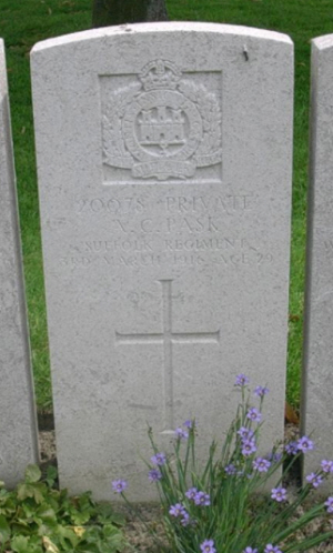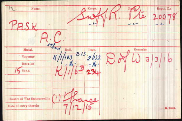 1891 census...Aged 4, he was at Bury Road Cottages, Chedburgh with his father Charles PASK [30] farm labourer bron Depden; his mother Georgianna [30] born Chedburgh; brothers Herbert George [6] born Rede, Walter [3] born Rede and Benjamin Alan [7 months] born Chedburgh. 1901 census...Aged 14, farm labourer, he was "by The Green", Depden with his parents (father now recorded as born Chedburgh); brothers Herbert George and Chas Walter both farm labourers, and Benjamin, now recorded as born Rede. He married Susan MURFITT [30-10-1892] in 1910 later of Tower House, Cambridge Road, Ely 1911 census...Aged 24, a blacksmith, he was boarding, with his wife Susan[20] born Littleport and son George [10 months] born Prickwillow, with his wife's MURFITT family at Prickwillow. His parents had moved to Rede. On the pension card his widow was at Ely Road, Prickwillow with their four sons, George Alfred [15-5-1910], Walter Claud [28-8-1911], Cecil [10-10-1912] and Albert Ernest [25-3-1916] His brother Charles Walter died of influenza in December 1918 in France see here |