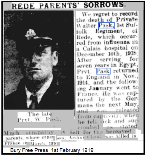 Charles Walter PASK was born in Rede (1st qtr 1888 Thingoe 4a:701) son of Charles and Georgianna PASK (née KEMP). The Army seemingly