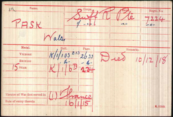 1891 census...Aged 3, he was at Bury Road Cottages, Chedburgh with his father Charle PASK [30] farm labourer born Depden; his mother Georgianna [30] born Chedburgh; brothers Herbert George [6] born Rede, Arthur [4] born Rede and Benjamin Alan [7 months] born Chedburgh. 1901 census...Aged 13, farm labourer, he was "by The Green", Depden with his parents (father now recorded as born Chedburgh); brothers Herbert George and Arthur Claude both farm labourers, and Benjamin, now recorded as born Rede. 1911 census...Aged 23, he was at Mustapha Pasha Barracks, Alexandria, Egypt, a Private in the Suffolk Regiment. His parents had moved to Rede On the pension card his mother was at Kiln Lane, Rede His brother Arthur died of his wounds, in Belgium in 1916 see here |