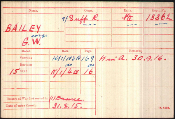 George William Bailey was born in 1898 in Horringer (2nd qtr 1896 Thingoe 4a:791) son of George and Jessie BAILEY(née WHITE). His mother died in 1898