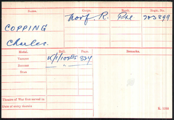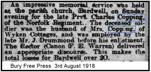 Charles Copping was born in Wickhambrook (Risbridge Q3-1888 4A:617), baptised in Wickhambrook on 5th August 1888, son of Arthur and Melinda Jane COPPING