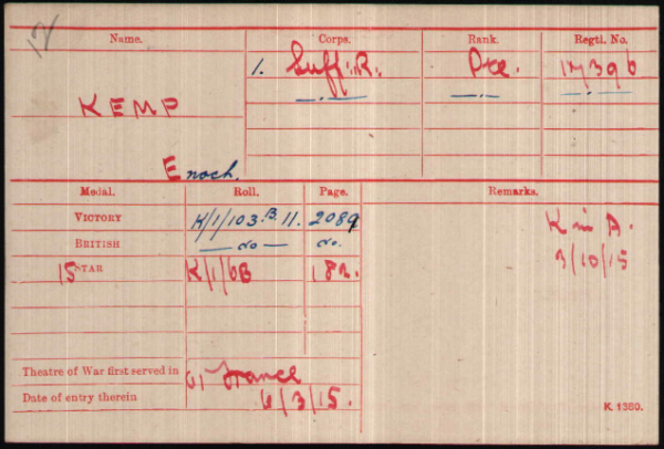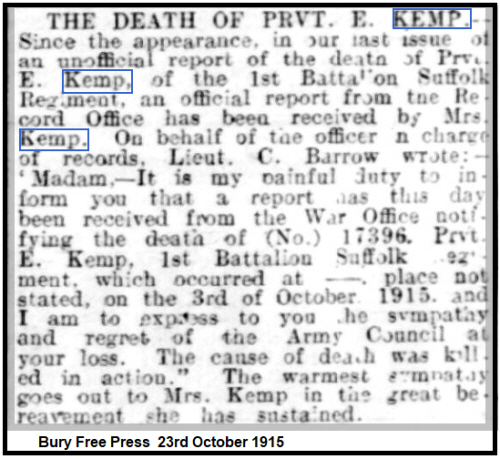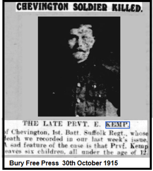 1881 census...Aged 1, he was at Ladies Green, Wickhambrook with his father William KEMP [33] labourer, born Dalham; his mother Hannah [32]; sisters Jessie [13], Ellen [11], Eliza [10] and Jane [3]; twin brothers William and Walter [9] and Joseph [6]. All except his father were born in Wickhambrook. His mother died in 1884 1891 census...Aged 11, a farm labourer, he was at Barber's Lane, Wickhambrook with his widower father (now recorded as born in Wickhambrook); sisters Ellen and Jane; twin brothers William and Walter, and Joseph. All the males were farm labourers. 1901 census...Aged 21, he was in the 1st Battalion, Suffolk Regiment in South Africa. His father (recorded born in Dalham) and sister Eliza were living near the Queens Inn, Wickhambrook. In 1903 he married Lily MISON from Ousden [29-7-1882] 1911 census...Aged 30, he was a farm labourer, at New House Farm Cottages, Wickhambrook with his wife Lily [28] born Ousden; sons Charles Herbert born Ousden and Enoch [8 months] born Wickhambrook; daughters Gladys Mabel[5] and Ruby May [3] both born in Wickhambrook. At some time after Enoch Junior's birth they moved to Chapel Yard, Chevington. On the pension card the children's births are recorded as Charlie Herbert MISON [8-10-1903], Gladys Mabel [20-1-1906], Ruth May [25-3-1908], Enoch [10-7-1910], Winifred Grace [25-6-1912] and Kathleen Lily [17-10-1914]. From this it can be seen that he was probably more likely to have been named on Wickhambrook memorial, but he is not. |