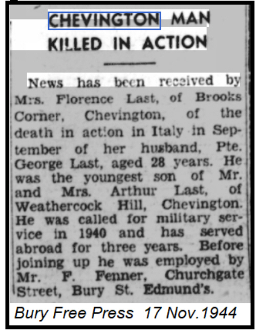 George Last was born on 12th December 1915 in Chevington (1st qtr 1916 Bury St.Edmunds 4a:2701 ) son of Arthur and Clara LAST (née