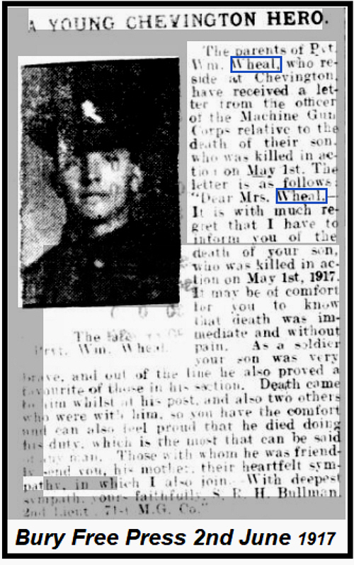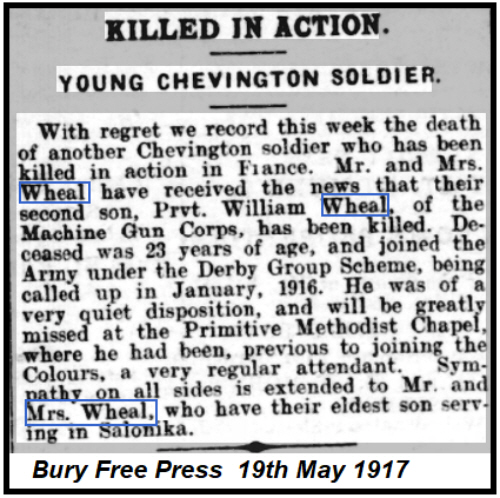 1901 census...Aged 7, he was at Frantons Farm, Nevendon with his father John WHEAL [30] horseman on farm born Hutton, Essex; his mother Mary A [28] born Hatfield Peverel; brothers John [9] born Pitsea and George A [11 months] born North Benfleet; sisters Ethel J [4] and Elsie A [2] both born Basildon. 1911 census...Aged 17, a butcher's assistant, he was "near the Smithy", Chevington with his parents; brothers Jack (farm labourer), George, and Ernest [6] born Chevington; sisters Elsie and Rose [1] born Chevington. On the pension card his mother was at Chevington |
