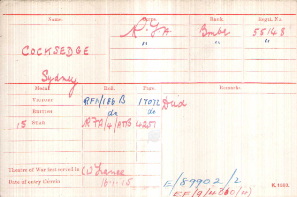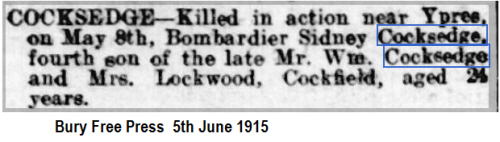 Sidney Walter Ccoksedge was born in Cockfield (1st qtr 1891 Cosford 4a:735), son of William James and Clara COCKSEDGE (née GRIDLEY).