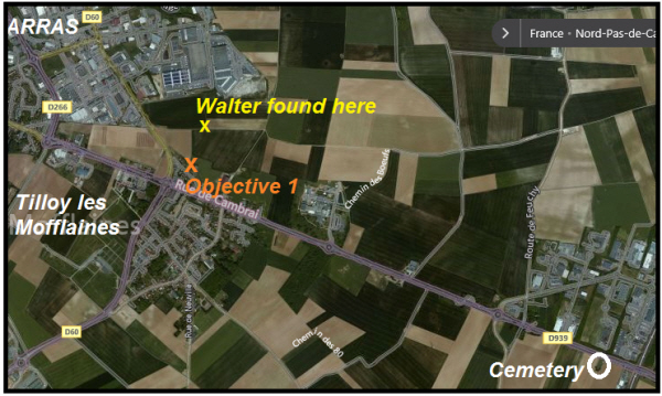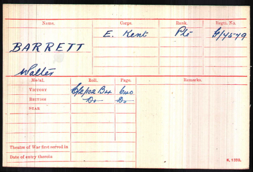 His entry in Du Ruvigny's Roll of Honour reads :- BARRETT, WALTER, Private, No.7579, 6th (Serivce) Battn. The Buffs (East Kent Regt.) s. of William Barrett, of Church Road, Castle Camps,by his wife, Harriet, dau. of William Osborne; b.Castle Camps aforesaid 2 March 1896; educ.Castle Camps School; was a farm labourer; enlisted in the Buffs in June 1915; served with the Expeditionary Force in France from 6 March 1916, and was killed in action at the Battle of Arras 9 April 1917. Buried to the west of Arras:unm. The war diary:- Arras- 9-4-17 - Zero day. The Bn was all formed up in Reserve trench, duplicate reserve and BROAD WALK by 3:30 am. At zero hour, 5:30am our artillery and machine guns opened an intense fire on the German lines and at the same time the Bn left the trenches,moving to the attack in artillery formation in support of the 6th Bn, The Queens. The 6th R W Kent Regt was in support on the left top the 7th R East Surrey Regt.On the right was the 13th Bn KINGS (Liverpool) Regt. 3rd Div Bn boundaries on crossing our front line were (ARRAS map) south G.30.c.8.1 - north G.30.c.9.6. The Bn moved forward as under C Coy on the right, D Coy on the left, A Coy plus 1.5 pt B Coy right support, B Coy less 1.5 pt left support and Bn HQ After passing through 6th Queens, the 1st objective - the BLACKLINE (HAVANT LANE-HORNSEA TR Road at H.31.a.6.7. was quickly captured by the Bn without much loss. A two hour bombardment of the enemy's second system- the BLUE LINE- followed and the advance was resumed as the barrage lifted forward. More opposition was encountered than before, snipers and machine guns being active on both flanks. After some stiff hand to hand fighting D Coy were able to get round to the flank and by rifle grenading concealed machine guns, pushed forward in shell holes, captured HOULETTE WORK, their objective on the BLUE LINE. C Coy on the right were troubled by enfilade MG fire operating from the right flank from the ruins near ESTAMINET CORNER. By means of Lewis gun fire and rifle grenading these were however eventually silenced and this company was able to proceed. The Blue Line was then consolidated and Lewis guns pushed forward and strong points dug. At 2:18 pm the 35th Inf Bde passed through this Bn final objective. CWGC records the battalion had 42 killed, 22 with no known grave