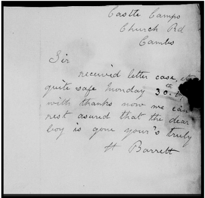 1901 census...Aged 5, he was in Castle Camps with his father William BARRETT [36] farm labourer; his mother Harriet [34] born Shudy Camps; brothers Thomas [12], Arthur [10] and Ernest [3 months]; sisters Alice[9], Martha [6] and Eva [3]. All except his mother were born in Castle Camps. 1911 census...Aged 15, a farm labourer, he was at Church Lane, Castle Camps with his parents; sister Eva; brothers Ernest, Albert [7], Willie [4] and Eli [1]. The new siblings all born in Castle Camps.His mother had borne 12 children but 2 died already died. When his mother completed the "Living Relatives" form for the Army on 9th August 1919 she entered herself and his father at Church lane, Castle Camps together with his brothers Ernest [18], Albert [15], Willie [9] and Eli [9]. Brother Thomas [31] was at 142 Stanhope St, Euston Rd, London, Arthur [29] at Euston St, Euston Rd, London; sister Alice [28] at 29 The Hillock, Park Hill, Ealing and Martha [25] and Eva [22] both at Ely House, Mount Ararat Road, Richmond. |