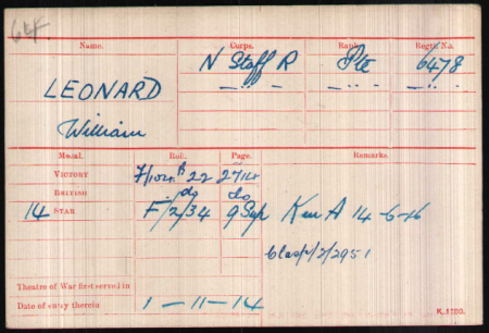 1891 census...Aged 7, he was at Haverhill Road, Castle Camps with his father Charles LEONARD [56] shepherd; his mother Emma [40], brothers Charles [14] (no occupation given), Alfred [9] and Henry [1 month]; sisters Martha [12], Nellie [4] and Annie [1]. All were born in Castle Camps. 1901 census...He has not been identified in this census, from his Army number he may well be in the Army. He was certainly at least a reservist when war broke out. His mother was in Castle Camps (now recorded as born Shudy Camps) with Alfred, Nellie, Annie and Arthur (Henry?). His father was in the workhouse in Linton. 1911 census...Possibly... Aged 25, an ironstone miner, lodging at Patten Lane, Rylet, Guisborough, Yorks with Charles (his brother ?) and Jane LEONARD and their children He married Annie Ethel CUTTLER (Guisborough Q4-1912) who in 1920 married John G. HAWKES, 21 Jackson Street, Coundon Grange, Bishop Auckland.  |