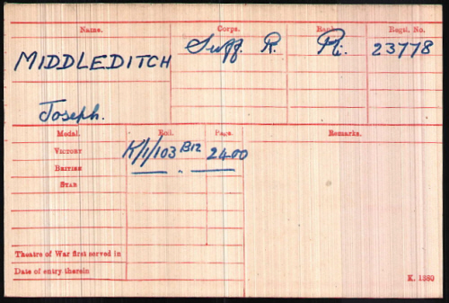 Joseph Middleditch was born in Castle Camps (Linton Q2-1896 3B:501), baptised in Castle Camps on 31st May 1896, son of John and Rosetta MIDDLEDITCH