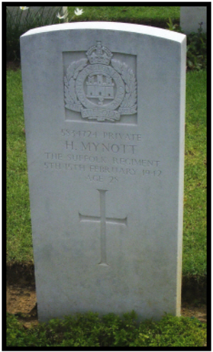 | The 4th Suffolks were fighting between the MacRitchie reservoir and Mount Pleasant and Henry was killed the day before the surrender of Singapore to the Japanese. The battalion had been in Singapore for only 16 days. CWGC record him as dying between 5th and 15th February, initially buried on 28th June 1942 in Adam Park Cemetery and transferred to Kranji 26th June 1946. |