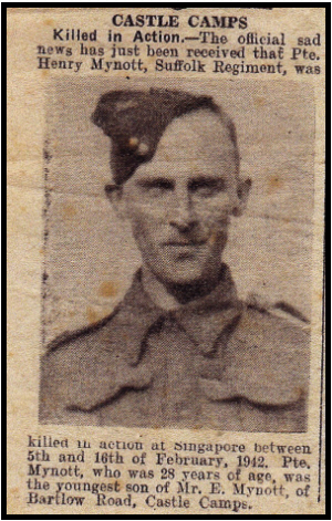 Henry Mynott was born in Castle Camps (Linton Q3-1913 3B:856), baptised in Castle Camps Congregational Church on 29th June 1913, son of Esau [30/11/1879] and