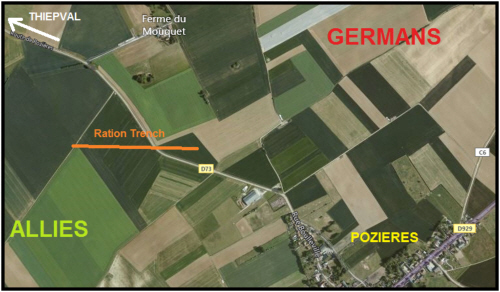 from Lt Col Murphy's "History of the Suffolk Regiment: "The 7th Suffolks took over trenches west of Pozières on 3rd August. On the 8th the Germans captured about 80 yards of Ration Trench but that evening the Battalion retook it and gained an additional 200 yards. The CWGC records that the battalion lost 50 killed on the 9th August 1916, only 7 having identified graves. He fell with a chum from Castle Camps, Joseph Middleditch see here