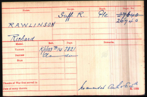 Richard Rawlinson was born in (Linton Q4-1878 3B:530), baptised in Castle Camps, Congregational Church on 9th March 1879, son of James and Emma RAWLINSON