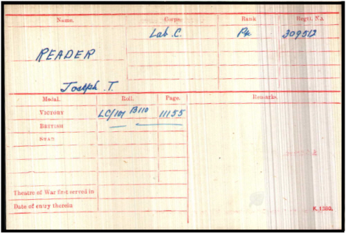 believed to be Joseph Thomas Reader was born in Staveley, Derbyshire(Chesterfield Q2-1894), son of George and Eleanor REEDER (née LENNARD from GRO records) The Cambridgeshire banns register gives the marriage as George READER to Juliana LEONARD of Castle Camps, in Horseheath in 1877. That in turn has been transcribed on fbmd and Find my past as Selina LEONARD. With the many changes of name there is room for error, but this appears to be the most likely family. 1901 census...Aged 6 he was at Dalesforth Terrace, Skegby, Mansfield with his father George Reeder [40] railway platelayer born Cambs; mother Julia [42] born Cambs; brothers David [21] railway platelayer, Mark[14] above ground mining labourer, both born Cambs; sister Ethel 10 born Staveley. There was another brother, George born Cambs 1878. 1911 census...Aged 16, a farm labourer,he was in Castle Camps with his uncle and aunt, Mark John BARRETT [52] blacksmith and Celia BARRETT ( his mother's sister) (n&eacaute;e LEONARD) [51] both born in Castle Camps. His widower father and brother Mark were living in Manfield Road, Skegby with his other brother David,wife and family. Here the Cambs places of birth are recorded as Horseheath |