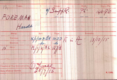 His elder brother Norris Robert FOREMAN was killed in Flanders in 1916 in the Suffolk Regiment |