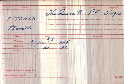 Neville Fitches was born in Chippenham on 21st February 1897 (Newmarket Q1-1897 3B:550) and baptised in Chippenham on 25th April 1897. He was the 3rd