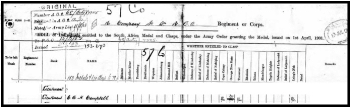 1881 census...Aged 1, he was at Holme Slack House, Fishwick, Preston with his father Donald A CAMPBELL [30] Captain 108th Foot, born East Indies and his mother Charlotte [27] born Norwich. 1891 census...Aged 11, he was at The Village, Stonham Aspal with his father Donald A CAMPBELL [40] (Lt Colonel, Infantry, born East Indies; his mother Charlotte [35]born Norwich; sisters Augusta C.L. [9] born Ireland and Victoria D.C. [4] born Padiham, Lancashire; brother Duncan D H [7] born Camberley, Surrey 1901 census...Aged 21, he was in South Africa in the Royal Garrison Artillery. As 2nd Lieutenant, he left Tilbury on 28 Apr 1900 on the Orotavia, and returned from Durban on the Nubia on August 5th 1902. 1911 census...Aged 31, single a Captain, Royal Artillery, he was boarding at 8 Nightingale Place, Woolwich with John and Martha PECK (invalid Army pensioner and his boarding house wife) At probate his will has his address as Gothic House, Clare,Suffolk. From the medal index card is appears his father, by 1923, had moved to Wickham Hall, Eye. His brother Duncan was killed serving in France with the Royal Field Artillery in 1917. see here |