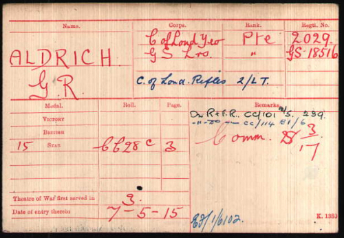 He enlisted in London in the City of London Yeomanry (Rough Riders) No.2029 on 12th November 1912, giving his age as 30 years 3 months, a bank clerk, born in Diss, Norfolk. He was employed by the Capital and Counties Bank, 176 Upper Clapton Road, London N.E. . He had previously served in the 4th Norfolk Volunteers, but resigned when he went to live in Ireland. He was 5 feet 8.5 inches tall, chest 33.5" to 36.5". He was embodied as a trooper on 5th August 1914. Posted to the Egypt Expeditionary Force on 10th April 1915, arriving on 7th May 1915 as a private when serving in the City of London Yeomanry (Rough Riders). This was then changed to serving in the Mediterranean Expeditionary Force on 14th August 1915. He sustained a shrapnel wound in his back and was taken to No.14 Casualty Clearing Station on 18th October 1915 and transferred to 19th General Hospital, Alexandria, Egypt on 16th November, by which time he was also suffering from jaundice. On 17th he was shipped via Hospital Ship "Lanfranc" to UK, where he arrived on 5th December 1915. In April 1916 a Mrs Savile of 42 Guildford Street, London had written to the Army to try and find his address as she had lost his mother's address, She said she had last seen him when he was stationed at Bacton, Norfolk, expecting soon to be sent overseas. One of his papers has his next of kin as Mrs E Aldrich, 42 Ranelagh Avenue, Barnes SW. but then it was changed to his wife, Mrs G.R.Aldrich of 2 Prices Avenue, Cliftonville, Margate, then she changed her address to "El Carmen" Birchington on Sea, Kent. He was transferred on 14th June 1916 to a cadet Battalion, then in November to the (?) Oxford and then in February 1917 to the Reserve Cavalry Regiment, at Marlborough Barracks, Dublin, Ireland, from which he was discharged on 28th March 1917 on commissioning into the London Regiment. One reference, from Major Pery, said he had served on East Coast Defence for 5 months, then in Egypt (Suez Canal Defence) near Suez for 4 months, subsequently in Gallipoli at Suvla Bay. He was commissioned on 25th March 1917 in the 23rd (Reserve) Battalion, the London Regiment. His papers on commissioning confirmed his educated at the East Anglian School. He arrived in France on 15th July 1917 and joined his last unit, 1st/23rd Battalion, London Regiment on 28th July. There was the usual battle between the Army pay department and his executors to sort out the estate without delay, including an application to apply the Death Duties (Killed in Action) Act of 1914 to his estate which was estimated to be between £1,000 and £1,500. The battalion war diary has:- Forward Area 57c C.N.E. 4th Dec Enemy showed considerable activity all day 3 pm Four 5.9 guns blown up by R.E. 6 pm Orders were received from 142nd Infantry Brigade to evacuate positions and withdraw to HUGHES SWITCH Area. All small arms ammunition, bombs etc from Battalion HQ and front line trenches to be collected and dumped on Cambrai-Bapaume road at 57c.E.24.c.5.4. to be salved. HQ moved back to HUGHES SWITCH at 11.45 pm. 2/Lt G.R.ALDRICH and 2 other ranks killed. His executors were jointly, Lawrence Walter OLDFIELD and Bertie George PANKS and his address given as 42 Ranelagh Gardens, Barnes, Surrey |
