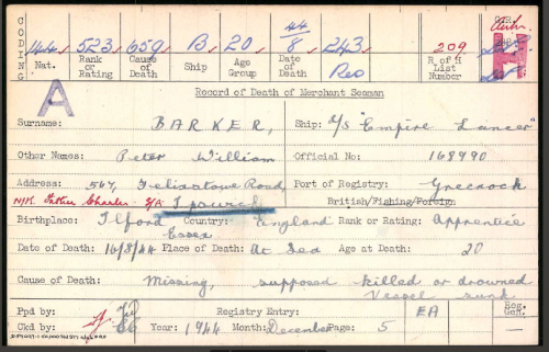 Peter William BARKER was born in 1924 in Ilford, Essex (Tendring Q2-1924 4A:892), son of Charles William and Ethel E. BARKER
