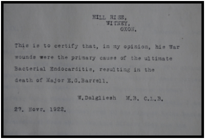 a student. 16th October 1916 he was 2nd in command of his company and on 4th July 1917 promoted to acting Captain, i/c 103 Company. He was gazetted 1st January 1918 Military Cross:- T/Lt. (A/Capt.) Ernest Gibbons Barrell M.C. M.G.Corps. For conspicuous gallantry and devotion to duty during an enemy attack. Under heavy fire he continually made personal reconnaissances (sic) to get in touch with the situation. He sent back most valuable information at a time when most of the signal wires were cut. He did splendid service. He was promoted to Acting Major in February 1918, and wounded in action by an enemy aircraft on 26th June 1918 near Amiens. This gunshot wound (penetrating chest) him resulted in attending No.54 Field Ambulance, then via 41st C.C.S. to No.5 General Hospital, Wimereux before being evacuated to UK on HM Hospital Ship "St.Andrew". Admitted to Hall Walker Hospital, Regents Park, London on 14th July 1918, sent to Somerville (3rd Southern General Hospital, Oxford on 29th October 1918 from where he was discharged to home on 22nd November 1918, pending discharge. From then on it seemed there was a continual battle with the Army to obtain a war or wounded gratuity and after his death his widow struggled to obtain a refund of death duties, which seems to have been unsuccessful. He was awarded a bar to the Military Cross but the date is illegible on his documents. He was discharged as a result of his wounds, to The Square, Witney, Oxfordshire, (silver war badge No. 314445) and died on 15th February 1922. The note below clearly indicates a medical opinion that his wounds were responsible for his death. The Commonwealth War Graves Commission however have a cut off date for the Great War of 31st August 1921. The gap between his wounding and death was deemed too long to satisfy the Inland Revenue when asked to refund death duties. His medals were sold for £1,800 at auction (DNW) on 30th March 2011. |