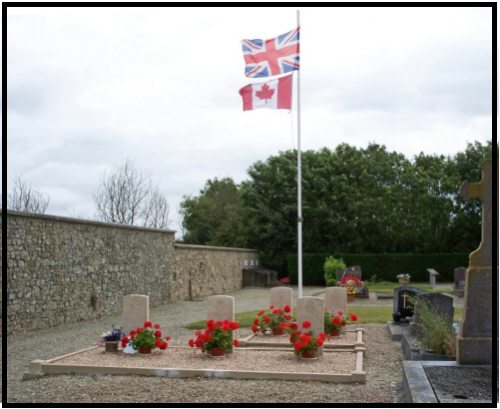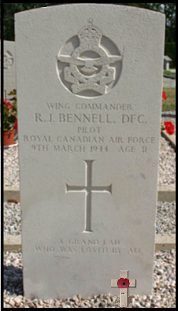 27th February 1943, one unidentified enemy aircraft damaged 3rd March 1943, one Do.217 destroyed 21st May 1943, one unidentified enemy aircraft damaged 2nd July 1943 his Mosquito was damaged by return fire from an He 111 and flak and he made a successful landing at RAF Ford on one engine 6th September 1943, one Do.217 and one unidentified enemy aircraft destroyed. He was Commanding Officer of 418 Squadron from February 1944 until his death in March 1944. 418 Squadron RCAF was Canada's highest-scoring squadron in WW2, in both air-to-air and air-to-ground kills, and of both day and night operations. Citation for his Distinguished Flying Cross:- BENNELL, Acting S/L Richard James (C1376) - Distinguished Flying Cross - No.418 Squadron - Award effective 7 October 1943 as per London Gazette dated 26 October 1943 and AFRO 2507/43 dated 3 December 1943. While serving with No.418 Squadron, this officer has completed many sorties over enemy territory at night. He has attacked numerous airfields with success, while on operations against rolling stock he has damaged several locomotives. In addition he has shot down three enemy aircraft. Squadron Leader Bennell is an inspiring leader whose great skill and determination have been reflected in the high standard of efficiency of his flight. He was also awarded the United States Air Medal:- BENNELL, S/L (now W/C) Richard James, DFC (C1376, deceased) - United States Air Medal - Overseas - Award effective 4 June 1943 as per Canada Gazette dated 4 May 1946 and AFRO 473/46 dated 10 May 1946. Public Records Office Air 2/9599 has recommendation dated 14 May 1943. "When certain U.S. aircraft which were moving from Northern Ireland to the United Kingdom became lost while flying in bad weather, Squadron Leader Bennell and another officer located them and enabled them to land successfully." Press Release 1523 from Headquarters, European Theatre of Operations, United States Army, 14 July 1943 (found with Air Ministry Bulletins) gives a portion of a more complete citation:- Squadron Leader Bennell, Royal Canadian Air Force, while serving as a pilot of a Royal Air Force plane (in 1942) was despatched to intercept and guide to base a flight of United States planes. Under extremely adverse weather conditions he located the flight and, displaying exceptional courage and skilful airmanship, led it to a safe landing at a friendly base. Without this assistance it is highly probable that several airplanes and their crews would have been lost." On 9th March 1944 he was pilot of De Havilland Mosquito FB VI ser.no. LR270 on a Ranger Mission to Rennes, France, from RAF Bradwell Bay. His navigator was Flying Officer Francis SHIELD DFC, RAFVR. They were recorded as missing east of Avranches, no claim has been found for shooting them down. Presumably they crashed in the sea and were washed ashore, they are buried side by side in Lessay. |