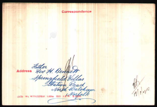 1891 census...Aged 2, he was at Freeman Street, Wells next the Sea, Norfolk, with his father Henry BENNETT [33] a Primitive Methodist Minister, born Milford, Derbyshire; his mother Mary S [33], born Lynn, Norfolk; sisters Lilian M [5] born East Harling, Norfolk and Constance Daisy [1] born Wells next the Sea. 1901 census...Aged 12, his birthplace now recorded as Kirkley, Suffolk, he was at 24 Garland Street, Bury St. Edmunds with his father and sisters Lilian and Constance Daisy. His mother was visiting Frederick and Emma Hayden at 126 Gwydir Street, Cambridge Educated at the East Anglian School for Boys, Northgate Avenue, Bury St.Edmunds before going on to Higher Grade School in Cambridge. Admitted to Paradise Street (Higher Grade) School, Cambridge on 2nd September 1901, when resident at "Lyndhurst", Newmarket Road, Cambridge. 1911 census...He has not been identified in this census, but from his Army records he seems to have been in Egypt. His parents were at Victoria Road, Diss. According to Helen Kennett, an honorary curator at Harleston museum, with help from Diss museum manager, Basil Abbott, Sydney won a scholarship to Downing College, Cambridge in 1907. He played cricket for the College and Suffolk, also a member of the soccer team (photo above from The Griffin, College Magazine, Michaelmas 1916. ). He was later was a teacher in Egypt, returning at the outbreak of war. CWGC have his parents at Springfield Villas, Station Rd., North Walsham, Norfolk. His father applied for an application form for a war pension from 11 Broad Green Avenue, West Croydon His Army records only have Oakdene, Wellesley Road, Clacton-on-Sea for the family home. |