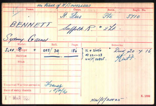 in Egypt as Sub-Inspector Agricultural for the Bank Of Egypt, but had returned to UK specifically to enlist in the Army On his application for a commission he stated that he spoke French and Arabic, knew Upper and Lower Egypt well and had been riding every day for three years. Unsurprisingly one of his referees considered he was well qualified to serve in Egypt. He was commissioned on 15th May 1915 and posted to the 3rd Battalion, Suffolk Regiment and sometime later moved to the 2nd Battalion where he served at the time of his death. He arrived in France on 10th February 1916. On the "Living Relatives form his father entered himself and Sydney's mother and sister Constance living at Oakdene, Wellesley Road, Clacton on Sea and sister Lilian KING living in Colchester. The "History of the Suffolk Regiment" by Lt Col Murphy has:- On July 20th the battalion, having assembled and deployed in Pont Street, took part in the renewed attacks of Longueval and Delville Wood. It was still dark when the artillery bombardment lifted and the advance began. The two Suffolk companies in the forward line moved in double lines of platoons with a front of 140 yards each. Much bitter fighting followed, which, though indecisive locally, enabled a footing to be gained in High Wood by a division (33rd) containing another Suffolk battalion, the 4th, and the British line to be linked up thence with Longueval. Casualties included officers killed, Capt A.L.Platts; Lt H.N.Kembels; 2nd Lts S.Johnson and S.G.Bennet. 5 other officers were missing, later reported killed. CWGC figures have a total , all ranks, killed as 113, of which 87 have no known grave and are named on the Thiepval memorial. Diss Express, Friday July 28th 1916 page 4:- "We learn with deep regret that Lieut. Sydney G.Bennett, was killed in action on July 21st (sic). The deceased was the only son of the Rev. H. and Mrs Bennett of Clacton on Sea. The Rev. Bennett was stationed in Diss for some years as Primitive Methodist Minister. Lieut. Bennett was educated at the East Anglian School, Bury St Edmunds and Higher Grade school at Cambridge. Whilst teaching at Springfield School, Ipswich, he gained a scholarship and passed on to Downing College, Cambridge, where, after a successful career he secured a good position in the teaching profession in Egypt. After war was declared he enlisted in the 3rd Suffolks, receiving his commission about 15 months ago. He had served several months in the trenches. He was well known in athletic circles, was good at cricket and often played for Diss, when visiting his parents in the town. He also played football and lawn tennis for local clubs. Bury Free Press 5th August 1916:- LOCAL CASUALITES - SUFFOLK COUNTY CRICKETER KILLED - EAST ANGLIAN SCHOOL OLD BOY Second Lieutenant Sydney G.Bennett, Suffolk Regiment, who has been killed in action was the only son of the Rev.H and Mrs. Bennett of Clacton-on-Sea. He was educated at the East Anglian School, Bury St.Edmunds, and the Higher Grade School, Cambridge. Whilst teaching at Springfield School, Ipswich he gained a scholarship and passed on to Downing College, Cambridge, where, after a successful career, he secured a good position in the teaching profession in Egypt. After war broke out he enlisted in the Suffolks, receiving his commission about fifteen months ago. He had served several months in the trenches. lieutenant Bennett was good at cricket and often played for Suffolk |