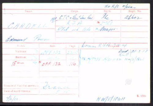 He was three times Mentioned in Despatches, on 15th June 1916, 4th January 1917 and on 11th December 1917. Military Cross gazetted 12th March 1918 Du Ruvigny's Roll of honour has:- CARDELL, EDMUND POWNE M.C. Major, 14th Light Division, Royal Field Artillery, ygst .s.of Edmund Harvey Cardell, of Great Paxton, St. Neots co.Huntingdon, Farmer, by his wife Elizabeth, dau. of F.P.Nickell; b. Launceston, co.Cornwall, 4 May, 1892; educ East Anglian School, Bury St.Edmunds and Nottingham University; he took a degree of B.Sc.of the London University (Engineering), and was on the staff of the British Reinforced Concrete Company; gazetted 2nd Lieut. R.F.A. in Sept.1914; served with the Expeditionary Force in France and Flanders from May 1915, and was killed in action near Passchendaele 21 March 1918. His Colonel wrote: "He was as brave as a lion, and his character was most exemplary. There was not an officer or man in the battery who did not love him". He was three time mentioned in despatches [London Gazettes 15 June, 1916, 4 Jan. and 14 De. 1917 by F.M. Sir Douglas Haig, and was awarded the Military Cross for gallantry and distinguished conduct in the field; unm There is some confusion here since Du Ruvingy has him in the Ypres Salient, and he is commemorated on the Somme. Dates of death are all either 21st or 25th March 1918 with most Army records showing 21st,( the first day of the German Spring Offensive, the Kaiserschlacht). The war diary definitely locates him at Essigny-St Quentin on 21st March, some distance from Ypres. 13th March - Vicinity of Bty positions shelled during the forenoon. "A" Bty had one man killed and one other wounded. Major E.P.CARDELL awarded the M.C..... 21st March - Terrific artillery and Trench Mortar fire opened by the enemy at 4:40 am followed by enemy attack in very thick fog. Bde lost 18 -18 pndrs at 6.45 hours. Twelve officers and one hundred and fifty other ranks reported missing. Of the twelve officers, Major E.P.CARDELL M.C. and 2nd Lieut.Robertson were known to have been killed. Our HQ were evacuated at 12:30 pm. 169 Bde who were in rear of battle zone as reinforcing Bde covered our zone. Remainder of Bde marched to Haut de Bois after supplying 169 and 298 Bdes with ammunition. Major Miller to command ? 46. The oak leaf on the Victory Medal ribbon signifies his Mention in Despatches, only one emblem regardless of the number of mentions. This was changed in 2014 for all mentions since 1962, after which multiple emblems can be worn with the medal. |