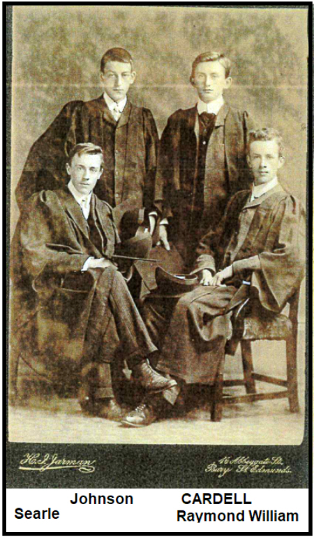 He was admitted to Great Paxton School on 14th September 1896, transferring to the East Anglian School on February 27th 1903. 1901 census...Aged 9, he was at Manor Farm, Great Paxton, Huntingdon with his father Edmund H. CARDELL [51] farmer born South Petherwin, Cornwall; his mother Elizabeth [41] born Helland, Cornwall; sister Alice N.[17] and brother Harold S. [10]. All the children were born in South Petherwin. 1911 census...Aged 18, an engineering student, he was visiting George (retired butcher) and Rebecca ATKIN at 53 Albert Grove, Nottingham from the school archives |