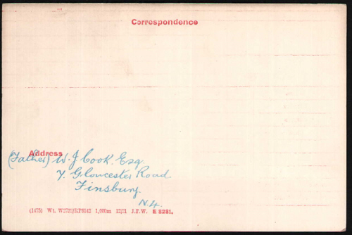 Reginald Cyril COOK was born in Barnet(Barnet Q1-1894 3A:244), son of William James and Emily COOK (née BOWDICH). 1901 census...Aged 7, Cyril was at 7 Gloucester Road, Stoke Newington, London, with his father William J COOK [40] insurance superintendent, born Clutton, Somerset; his mother Emily [43] born Temple Cloud, Somerset; brothers Stanley [20] commercial clerk born Bath; sisters Elsie [16] commercial clerk, Ida [13] and Irene [11] all born in Ealing and sister Gladys [3] born Barnet. 1911 census...Reginald Cyril, aged 17, an insurance clerk, he was still at 7 Gloucester Road with his parents; brother Stanley Foster (printer/stationer); sisters Ida Winifred (typist), Irene Constance (typist) and Gladys Geraldine (school). The family were still at this address at probate of his will. His name is not on the memorial plaque but he is named on Roll of Honour with his regiment, confirming his East Anglian School connection |