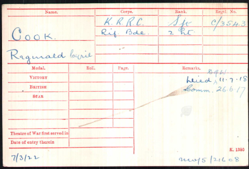 He enlisted in the King's Royal Rifle Corps, reaching the rank of Sergeant and then commissioned in the Rifle Brigade on 26th June 1917.