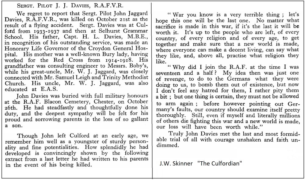 John Jaggard DAVIES was born in 1924 (Romford Q3-1924 4A:851), son of Richard Llewelyn and Kathleen Florence DAVIES (née JAGGARD), of South Croydon, Surrey