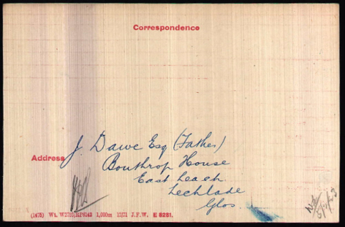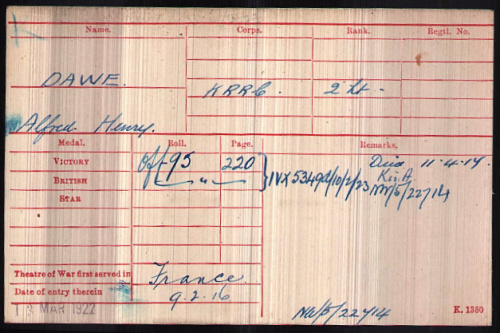 DAWE (née PERCY). 1901 census...Aged 6, he was at Wyddial Bury, near Buntingford, Herts with his mother Emily DAWE [39[ born Stoke Climsland, Cornwall and sister Margaret E [10], also farm bailiff George MORRIS [64] born Anstey, Herts. His father was still in Cornwall at Trevadlock on his father's farm. Also there were Alfred's grandfather, John Dawe, [79] farmer born Stoke Climsland, Cornwall; Alfred's single aunts Elizabeth DAWE [50] and Jane [46] both born in Lewannick. He then went on to the East Anglian School, and in January 1911 he moved on to Leys School in Cambridge. 1911 census...Aged 16, he was a pupil at Leys School, Trumpington Road, Cambridge. His parents were still at Wyddial Bury. On leaving Leys school (from http://www.launcestonthen.co.uk/lewannick.html) Alfred went to University at Downing College, Cambridge to study science. From the Downing "In Memoriam" pages:- He matriculated at Downing College in 1913 with the intention of reading for the Natural Sciences Tripos and the Diploma in Agriculture. Following the outbreak of war, he joined the University's Officer Training Corps in October 1914, at the start of his second year. At the end of that month he took part in the College Debating Society's Freshmen's debate. In early November 1914, with student numbers in College and Cambridge dropping as members left on military service, he played in a joint Downing-Queens' rugby team against a team made up of Welsh Internationals and Cambridge Blues, afterwards described as a 'sound hard-working forward'. By the end of Michaelmas Term 1914, Dawe had obtained his commission in the King's Royal Rifle Corps as Temporary 2nd Lieutenant. A serious motor cycle accident delayed his going abroad with his regiment until February 1916, when he rejoined them in France. He was the nephew of Elizabeth and Jane Dawe of Trevadlock who gave the land for the War Memorial in Lewannick. He is recorded in the East Anglian Record of August 1917 as being an alumni. In his Army papers, the "Living Relatives" form completed by his father on 19th September 1917 has his parents and sister Margaret at Ham Cottage, Brampton, Oxfordshire.