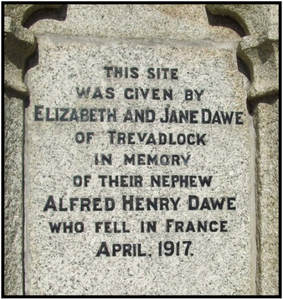 Alfred Henry DAWE was born at Trevadlock, Lewannick, Cornwall on 5th December 1894 (Launceston Q1-1895 5C:17) , son of Joseph and Emily