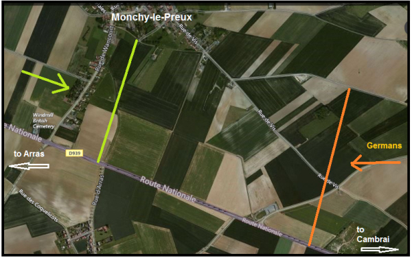 From http://www.launcestonthen.co.uk/lewannick.html:- "On the 11th of April 1917 he was leading his company as acting Captain and, with another company, succeeded in taking Monchy-le Preux. He then went forward to select a suitable spot on which to consolidate their position when he was killed instantaneously." The matter of his rank was discussed by his father in correspondence with the Army, who replied that Alfred was only ever 2nd Lieutenant, the fact that his father said his son was doing the work of a Captain and was overlooked for promotion due to his age was immaterial. The actual battalion war diary, despite being several pages long, unusually does not name the officer casualties this day CWGC figures show the 13th battalion suffered 31 killed on the 11th, only 9 have an identified grave. |