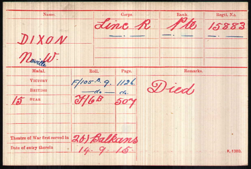 He enlisted in March 1915 in Gainsborough, Lincs, when he must have lied about his age. "Soldiers Died", incorrectly, has him born in Gainsborough. He died of bronchial pneumonia in No.45 Casualty Clearing Station at Awoingt. His legatee was Miss Lilian DUKE. The Gainsborough News of 22nd November 1918 reported:- DIXON, N.W. Pte. Lincolns We regret to have to record the loss of Pte Neville W. Dixon, another Gainsborough boy, the son of Mr & Mrs H K Dixon of 3 Arthur Road and late of Gringley on the Hill. Pte Dixon was one of those brave lads who felt the call of his country in the early stages of the war and joined up in March 1915 when only 16 years of age. After 4 months training in the Lincolns he was sent to Gallipoli where he received a gunshot wound to the knee which invalided him to the Palace Hospital in Cairo. In June 1916 he was called to France with many others and was present at Messines Ridge in 1917 and was gassed at Loos in March 1918 and was sent to England. On recovering he went to Ireland and to France in September last. Towards the end of October he was the victim of the influenza which turned to Bronchial Pneumonia and terminally fatal, in spite of the best nursing possible in the 45th Casualty clearing hospital on November 10th. Pte N Dixon was educated at the Gainsborough Grammar school, finishing at the East Anglia School, Bury St Edmunds and afterwards was apprenticed with Mr H C Lee of Silver Street. He was a bright and cheery disposition which helped him through many depressing circumstances and his many friends will regret that a career so full of promise has been thus suddenly ended. In the midst of the great rejoicing it is exceptionally hard for the parents, who having been looking forward to their boy's safe return receive instead the notification of his death, we are sure that everyone's sympathy goes out to this and any such cases in the neighbourhood. |