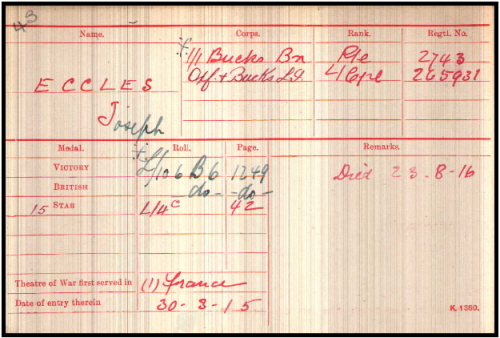 Joseph Blackburn ECCLES was born in 1896 in Wooburn, Wycombe (Wycombe Q1-1896 3A:728), son of William and Elizabeth Caroline ECCLES