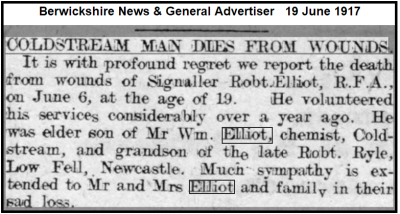 Robert ELLIOT was born on 29th April 1898 in Coldstream, Scotland at High Street, Coldstream (Coldstream Q2-1898 page 10:30), son of William Marshall and Isabella Mary ELLIOT (née RYLE). His father was a chemist/druggist. 1901 census...Aged 2, he was at Ravensworth Crescent, Gateshead, with grandparents, Robert RYLE [66] born Wickham, Durham, and Mary Jane RYLE [58] born Gateshead, his mother Isabella Mary ELLIOT [31] born Gateshead, aunt Agnes Freeman RYLE [28] born Gateshead; great grandmother Agnes Brett[91] born Gateshead. His father, William M Elliot [4] born Edinburgh, was at his business as a chemist/soda water maker at 70 High Street, Coldstream.. His sister Grace Agnes was born in Coldstream [1903-1986] and brother William Ryle [1908-1993] presumably in Coldstream. 1911 census...Aged 12, he was at 94, High Street, Coldstream with his parents, sister Grace A. and brother William R. The school roll of honour, giving his regiment, confirms his school connection. From the "East Anglian Record" it appears he was in Form V-b at Christmas 1913 |