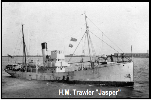 He was commissioned on 23rd August 1940. HM Trawler "Jasper" was taken over by the Royal Navy in 1935. Displacing 581 tons she carried one 4 inch gun. HMT Jasper, commanded by temp Lt.Hodson RNVR) was torpedoed and sunk by the German motor torpedo boat S-81 in the English Channel south of Bolt Head in position 50°10'N, 03°48'W on 1 December 1942.There were 10 survivors including the Commanding Officer, but eleven men died. |