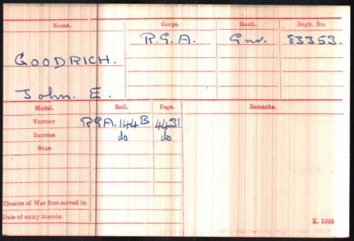 Before joining the Army, Bombardier J.E. Goodrich served in the Surrey V.T.C. and attained the rank of Corporal. Following the footsteps of his father, the deceased soldier was engaged in bank work and held an appointment in the Capital and Counties Bank at Redhill. He was 32 years of age.....