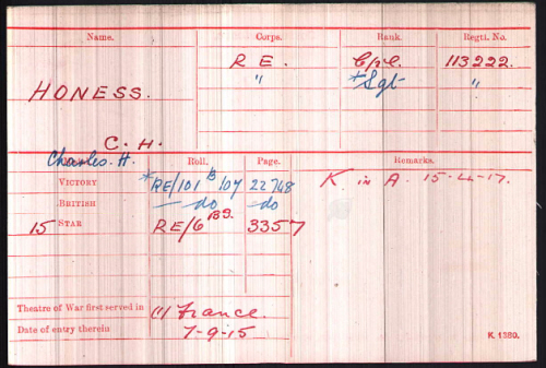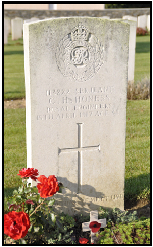 The Bury Free Press of 5th May 1917 reported:- AN EAST ANGLIAN SCHOOLMASTER KILLED -SERGT.C.H.HONESS The news of the death in action of Sergt. C.H.Honess will be received in Bury with very deep sorrow and regret by a wide circle of friends and acquaintances. From what we can gather, it appears that Sergt. Honess was killed whilst returning from the trenches at 4 a.m. on April 15th. He was well known in the town, having been upon the staff of the East Anglian School for a long period of sixteen years as Science master. He also actively associated himself with all branches of sport whilst at the School, and was in consequence a great favourite with all the boys. The gallant Sergeant answered his country's call in August 1915, enlisting in the Royal Engineers. He was attached to a special brigade of the R.E's concerned with the administration of poison gas. He had seen much service, having been in France since September 1915. A sad feature of his death is that he was expecting to come to England shortly on leave. The Bury Free Press of 10th July 1920 carried a lengthy tribute to Charles Honess:- A BURY SCHOOL MEMORIAL - Fine Tribute to the Late Mr. Honess - Esteemed by Governors, Loved by Colleagues and Pupils. A brass tablet to the memory of the late Mr. Charles H.Honess, B.Sc., for several years a member of staff of the school, has been placed on the wall of the main hall at the East Anglian School at Bury St.Edmunds, and it was formally unveiled by the late Headmaster (Mr. S.Leigh) at the Speech Day on Friday. The Chairman of the Governors (Sir Alfred Jermyn) remarked that is was fitting that the unveiling should be performed by Mr. Leigh, who said he performed the task with joy, mingled with sorrow and sadness. He drew aside the Union Jack which covered the tablet and read the inscription thus: "In memory of Charles Honess, B.WSc.,Lond., Sergeant, Royal Engineers, 15 years science master of this school. His earnest efforts to serve its highest interests won the esteem of the Governors and the affections of boys and colleagues. He enlisted in August, 1915, and gave his life for his country in April, 1917. 'You made us men, you taught us how to live; and in your wisdom taught us how to die'".................. A great number of school chemistry masters, chemists etc. were called up and placed in the Special Companies of the Royal Engineers. In fact they turned out to be very over-qualified labourers, most of their duties being carrying gas cylinders the last mile to the trenches, digging them in and trying to prevent them being blown up by enemy artillery. Then, given the signal, they released the gas. Sadly, due to ill fitting equipment causing leaks and much residue of gas remaining in the release trenches, many of them were overcome by their own weapon. It is hard to find much evidence of their knowledge of chemistry being any use. During the battle of Bullecourt on 11 April 1917, the Australians captured some of the enemy trenches, but were to be let down by lack of artillery cover. The men had to retreat and 3,000 were killed. Charles Honess died in the aftermath of a raid to gas enemy trenches to the east of Bullecourt. This was an night attack on April 14th. Gas was released using Livens projectors, small mortar-like weapons (of the 150 Projectors available on the night, 135 were actually used). As usual, ten minutes later the enemy answered with an artillery barrage and Charles was killed whilst returning to camp.