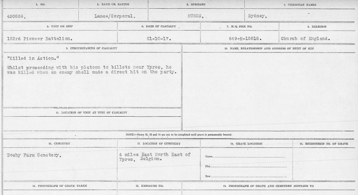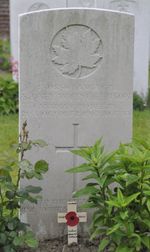 He enlisted in Victoria, British Columbia on 31st March 1915, giving his next of kin as father, William HUSON of Gazeley, Suffolk, England . Aged 31 (born 11th November 1883), he weighed 170 lbs (77.4 kg), was 5 feet 7 inches (170.2)tall, 42"-46"(106.7 to 127.3 cm) chest, grey eyes, brown hair, Church of England, occupation electrical engineer, educated East Anglian School, Bury St Edmunds. He was single on enlistment and had previous military experience with the 88th Victoria Fusiliers. click here to go to his Canadian Army records Posted to the 48th Battalion, they sailed from Canada on 10th July 1915. On the 9th March 1916 he went to France and on 12th November 1916 he was promoted to Lance Corporal. Transferred to the 123rd Battalion on 8th May 1917, he was then attached to 3 Division Signals Company on 18th May and was killed in action on 21st October 1917. Exactly where is not recorded but it was just outside Ypres. The Bury Free Press of 17th November 1917 reported:- GAZELEY POSTMASTER'S SON KILLED We regret to record the death in action of a very promising young man, who like so many of England's sons from over the seas, joined up to help the mother country in her hour of need. Lance Corpl. Sidney W.Huson, second son of Mr. H.W.Huson of the Post Office, Gazeley, had gone to the colonies to seek his fortune, and following the outbreak of the war, he joined the Canadians in British Columbia, and came to this country with the 48th, but was later transferred to the signal section of the Canadian Artillery and after about six months went out to France, where he did good service, as stated in letters from his officers to his wife after his death in action on October 22nd, warm and sympathetic testimony being borne to his bravery and other fine qualities.
