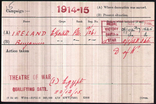 7th October 1894, youngest child of Charles Doughty and Ellen Margaret IRELAND (née BRIDGES). 1901 census...Aged 6, he was at 14 Arnold Street, with his father Charles Doughty IRELAND [48] Yeast Merchant's manager, born Brooke, Norfolk; his mother Ellen Margaret [48] born Hull; brother John {15] born Hull; sisters Grace [16] born Hull, Catherine [13], Violet [11] and Marion [9] all born in Hessle. Also there was a visitor, widow Jane SPENCE [[60] born Haxey, Lincs. 1911 census...Aged 16, an Architect's articled pupil, he was at "Ellesmere", Parkfield Avenue, North Ferriby, Brough, Yorks with his parents, brother John (yeast maker's clerk) and sister Marion (kindergarten student). The address for his father, to which his belongings were sent, was Messrs T Wittick and Sons, Cogan Street, Kingston upon Hull. The East Anglian School roll of honour, with its record of regiments seems to confirm his connection with the school