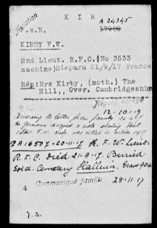 He tried farming in Canada, but decided to return to UK in 1913. First enlisting in the 1st/1st Northamptonshire Yeomanry on 23rd September 1914, trooper No. 1209 (later 145433), he was 5 ft 8.5 inches (174 cm) tall, chest 36.5" to 39.5" (92.7 to 100.3 cm). He was in France/Flanders by 6th November 1914, which means either he did not reach the front line by 22nd, or his family did not claim the clasp to his 1914 Star. He was admitted to 17 Field Ambulance on 31st July 1915 with dental caries and forwarded to 10 Casualty Clearing Station on 2nd August. Apparently evacuated to UK as he embarked at Southampton on 2nd August for Le Havre and rejoined B Squadron in the field. He underwent an R.F.C Morse examination in October 1916, being marked at 11 words per minute, very good accuracy and style. His score for receiving was only 4 w.p.m. explained by the fact that he had had no opportunity to practise. He was posted back to UK on 16th January 1917 for commissioning and he transferred to the Royal Flying Corps on 1st February 1917. From Royal Flying Corps depot, Farnborough, he arrived at School of Military Aeronautics, Royal Flying Corps, Oxford on 4th April 1917. He had been a trooper in the Northamptonshire Yeomanry for 2 years 7 months. Education - Cambridge & County School and East Anglian School, Bury St.Edmunds. A farmer, home address Over, Cambridgeshire and activities noted were Football, Swimming, Hunting, Shooting and Motoring. Gazetted temp 2nd Lieutenant, General List, Royal Flying Corps on 17th May 1917. Confirmed 14th July, and after training at 15 Training School, 11 T.S. and 56 T.S, he was posted to 19 Squadron on 25th August 1917 (extra annotation "Spad") He was last seen in combat over Dadizeele, Belgium on 21st September 1917 flying Spad Ser.No. B3533. His loss, at 9:50 am, was claimed by Hauptmann Oskar Gustav Rudolf Berthold, who was piloting an Albatross 3 of Jagdstaffel 18 His personal effects, returned by the Germans, were :- Wallet - Leather photo case containing photographs - Advance book - cheque book - Identity disc -Treasury note case - driver's licence - Photographs - 1 France - bunch of keys Initially buried by the Germans in the German extension to Halluin Communal Cemetery (grave 904) and moved to Pont du Hem in 1923. There is a very comprehensive account of his military career in John Symond's book, "Heroes of Over" No. 19 Squadron of the Royal Flying Corps was founded on 1st September 1915, training on a variety of aircraft before being sent to France in July 1916 flying B.E.12s and then re-equipping with the more suitable French-built Spads. Late 1917 the squadron started to receive Sopwith Dolphins to replace its Spads. In 1938 they were the first squadron to receive Spitfires . They are now disbanded (2016) ![]() ![]() |