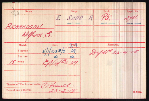 Wilfrid Ernest RICHARDSON was born in 1896 in Potton (Biggleswade Q3-1896 3B:355), son of Frederick William and Ellen RICHARDSON (née BENSON). 1901 census...Aged 4, he was at Hogg Hill, Potton, Beds with his father Frederick W RICHARDSON [38] auctioneer/furniture dealer, born Potton; his mother Ellen [42] born Worcester; brothers Herbert [11] and Frederick [6]; sister Edith [10]. All the children were born in Potton. 1911 census...Aged 14, he was at the East Anglian School, Bury St. Edmunds. His widower father; brothers Herbert and Frederick Stanley; sister Edith Mary were still at Hogg Hill, Potton. One child had died, his mother had died in 1906. NOTE.. On the census form there is another Wilfred Richardson, age 12 born Forest Gate, he was Wilfrid John Henry Richardson, the cousin of Christopher NICKELS, and was not a war casualty. |